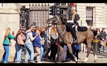 The tension builds quickly as the first command is ignored without hesitation. The King’s Guard issues a second shout, louder and sharper, leaving no confusion about expectations. Still, the tourist lingers, treating a working military post like a photo opportunity. By the third shout, the seriousness is unmistakable. This is no performance, but firm enforcement of rules designed to protect safety, tradition, and the powerful horse standing nearby. The guard’s voice carries discipline, not emotion, shaped by training that demands instant compliance. Surrounding tourists fall silent, stepping back as cameras lower and space clears. The entitled behavior collapses under authority, replaced by sudden realization and embarrassment. The guard does not move from his position, yet control is fully restored. Order returns within moments, proving words alone can prevent chaos when used correctly. The tourist retreats, shaken but unharmed, having learned a lesson the crowd will not forget. Respect settles back over the area as ceremony continues uninterrupted. This moment reinforces why boundaries exist and why guards enforce them without compromise. In the end, discipline triumphs, tradition is protected, and authority stands firm, reminding everyone that orders are not suggestions here.