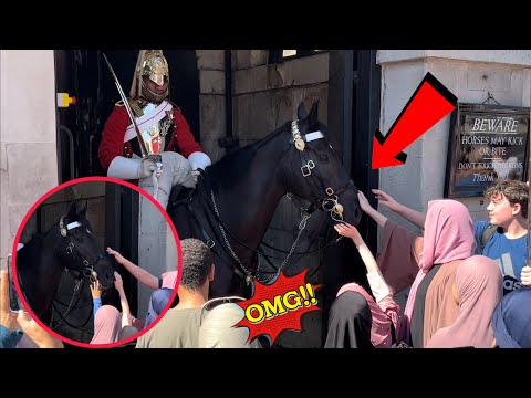 STUPID AND DISRESPECTFUL TOURIST PULLS THE HORSE REINS! UPSET KING’S GUARD LOOKS AT HER SHARPLY …